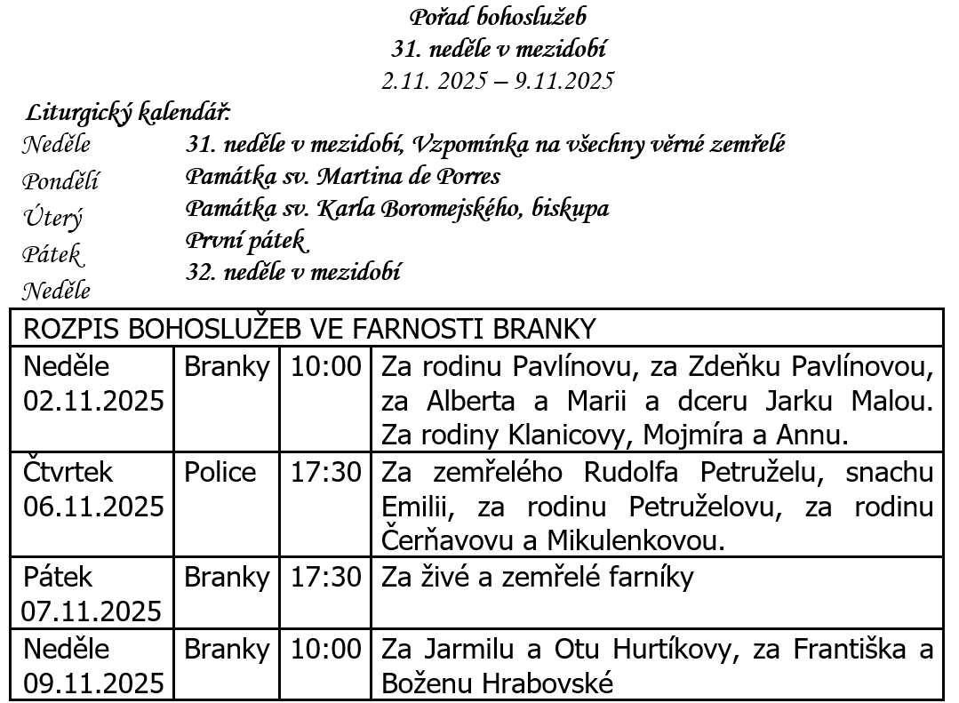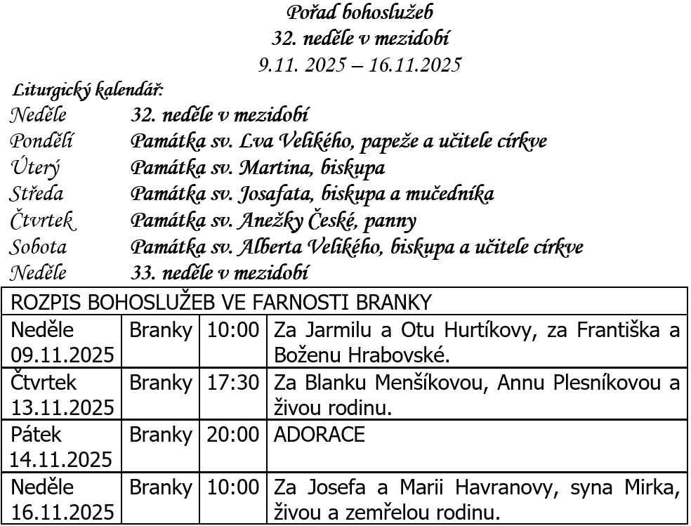 Sobota v 9:00 hodin kostel Branky a to první sobotu v daném měsíci.