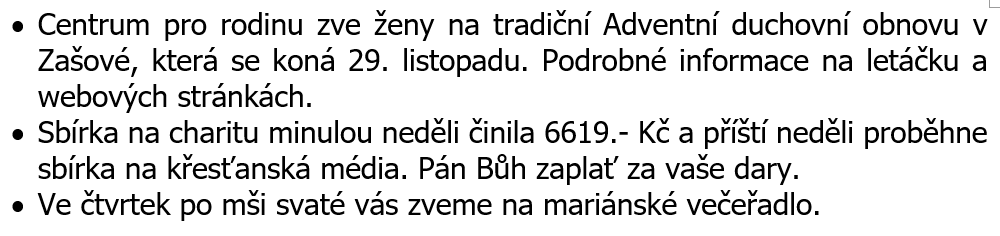 Před mší svatou je možno přijmout Svátost smíření ve zpovědi a 30 minut před mší svatou začíná modlitba Růžence Panny Marie